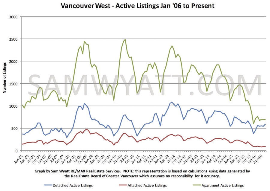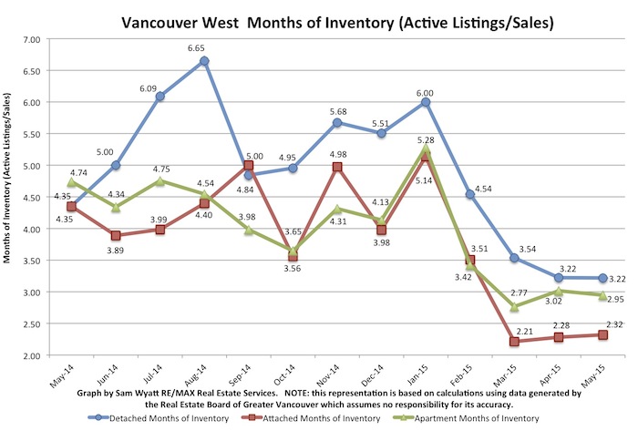*Remember that Months of Inventory (MOI) is a measure derived from the number of active listings during a given month divided by the number of sales that month. It indicates the theoretical length of time it would take to sell all of the properties on the market if nothing changed. Historically, 0-5 months of inventory has generally implied upward price pressure for the ensuing six months, 5-8 months of inventory meant a flat market with respect to pricing and over 8 months of inventory has, for the most part, precipitated downward price pressure.