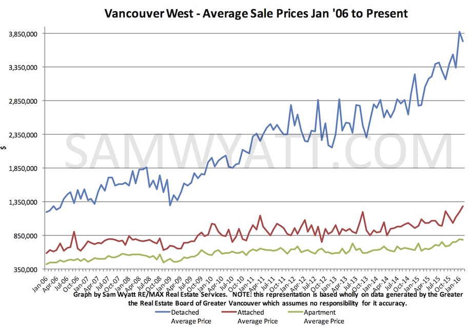 The Real Estate Board of Greater Vancouver's "HPI Price" for Westside homes helps smooth out the bumps and shows the steady rise in values for "typical" detached homes.